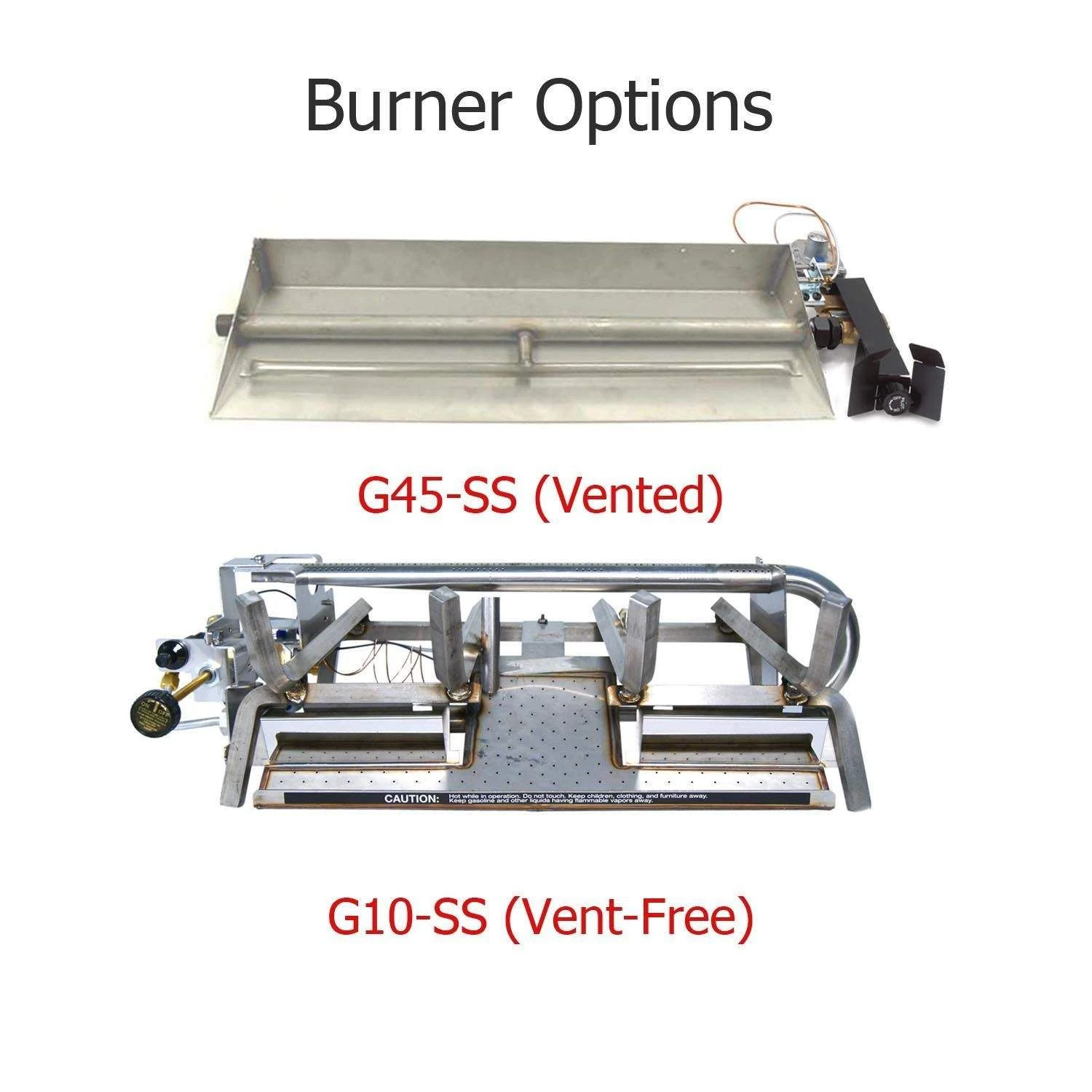 - Optional Gas Log Set – 24″ vented G45 burner with Charred Oak logs or ventless G10 burner with Charred Frontier Oak log options