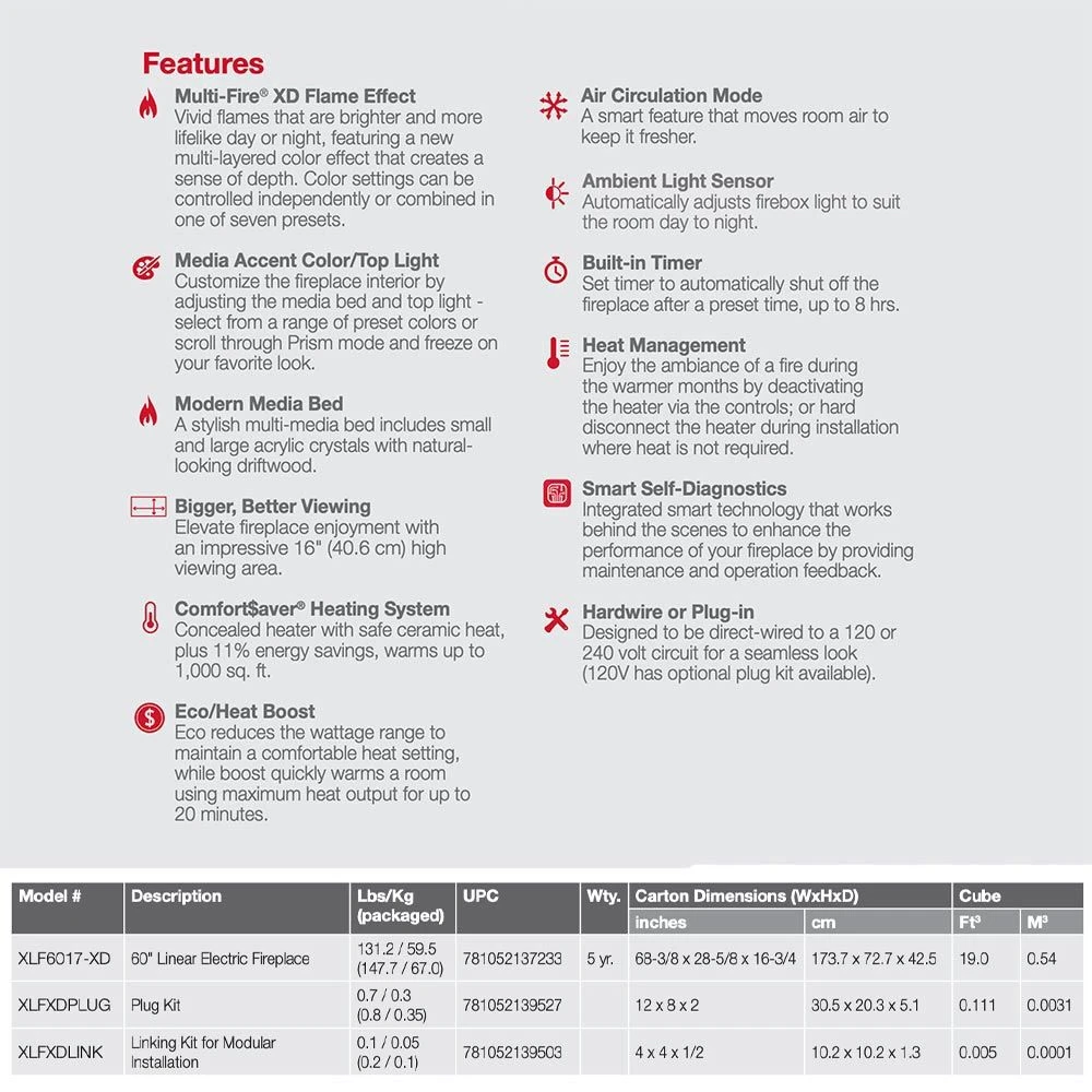 Dimplex XLF6017-XD IgniteXL Bold Deep Built-In Linear Electric Fireplace, 60-Inch provides a high quality, modern hearth option to improve your favorite living space. A patented mirror effect offers incredible visual depth to offer a realistic flame presence with the illusion of a real burning fire, and the multi-media bed uses two sizes of crystals and driftwood logs to complete the look. Multi-color accent lighting make it a breeze to customize the look of your Dimplex electric fireplace, and the integrated heater can provide up to 8,530 BTU when the fireplace is connected directly to your home’s 240V system. The included multi-function remote control provides an easy way to operate the flames and heater independently in order to offer year round use without the need for any venting or other requirements.