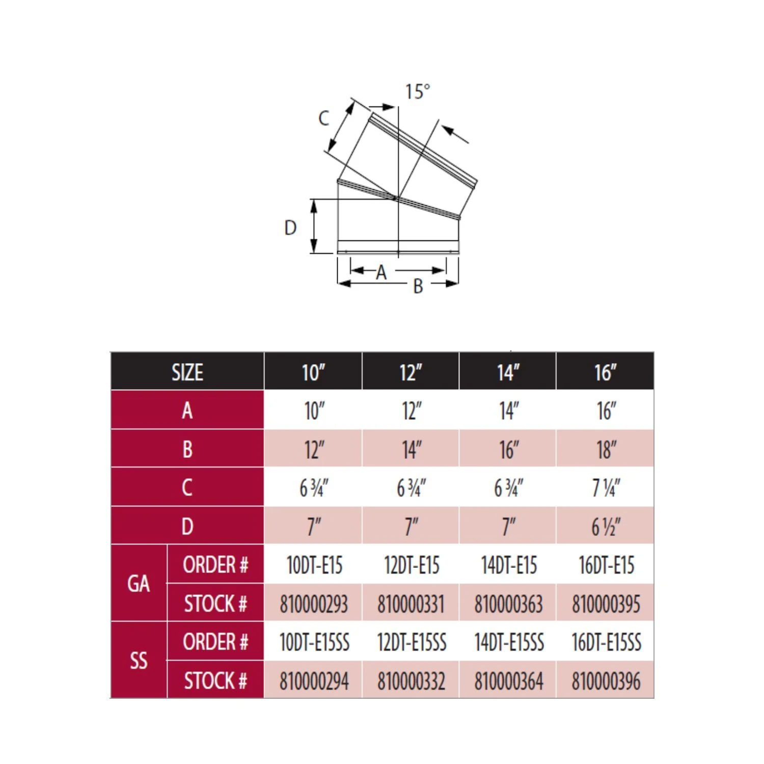 DuraVent 14DT-E15x DuraTech 15 Degree Elbow, 14-Inch Diameter provides a premium product for use with the DuraTech chimney system. This 15-degree elbow provides an offset for a chimney pipe to allow for routing around obstructions, such as rafters, ridgepoles, or joists. This elbow can be used in conjunction with one additional 15-degree elbow for an offset greater than 30 degrees (offsets greater than 30 degrees are not permitted by UL 103 standards). These components are available in galvalume and stainless steel outer walls options with a stainless steel inner wall.