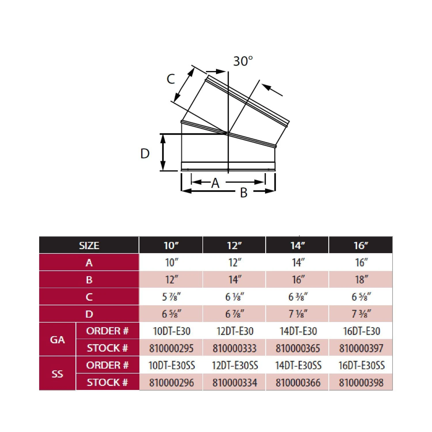 DuraVent 14DT-E30x DuraTech 30 Degree Elbow, 14-Inch Diameter provides a premium product for use with the DuraTech chimney system. This 30-degree elbow provides an offset for a chimney pipe to allow for routing around obstructions, such as rafters, ridgepoles, or joists. This elbow can be used in conjunction with one additional 30-degree elbow for a greater offset (offsets greater than 30 degrees are not permitted by UL 103 standards). These components are available in galvalume and stainless steel outer walls options with a stainless steel inner wall.