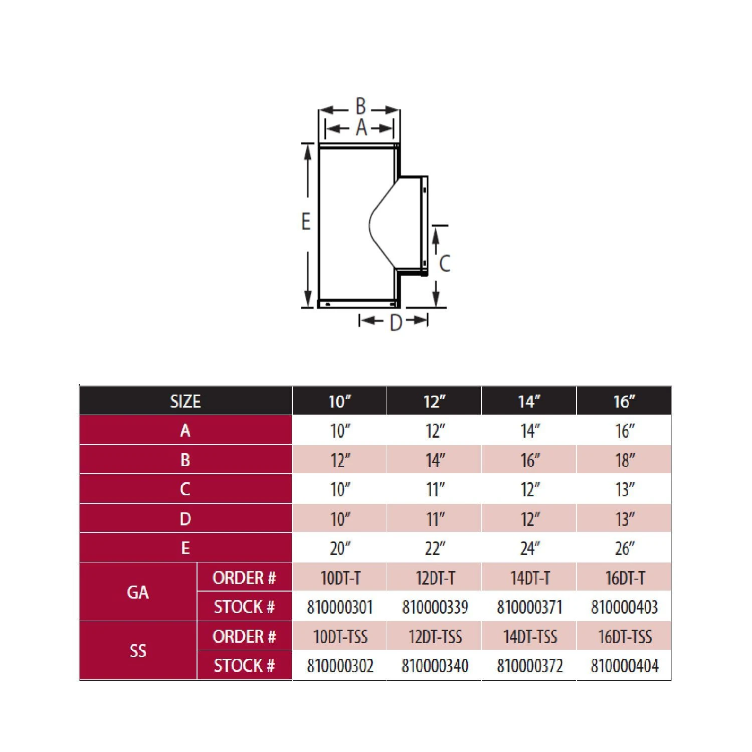 DuraVent 14DT-Tx DuraTech 14-Inch Diameter Tee with Cap provides a premium product for use with the DuraTech chimney system. This tee with cap installs with through-the-wall setups and includes a removable tee cap for easy chimney cleaning or inspection. Wall straps, a wall thimble, and an adjustable tee support bracket must be installed with the tee as directed. This component is available in stainless steel or with a galvalume outer wall and stainless steel inner wall.