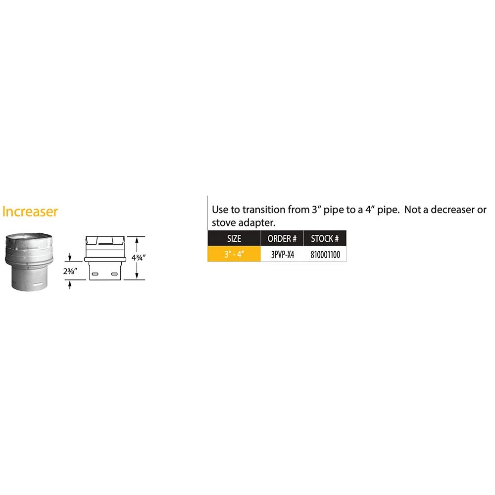 DuraVent 3PVP-X4 PelletVent Pro 3-Inch to 4-Inch Pipe Increaser provides a transition from 3? pipe to a 4? pipe. This pipe increaser attaches to appliance outlet to allow pipe to easily connect or disconnect.
