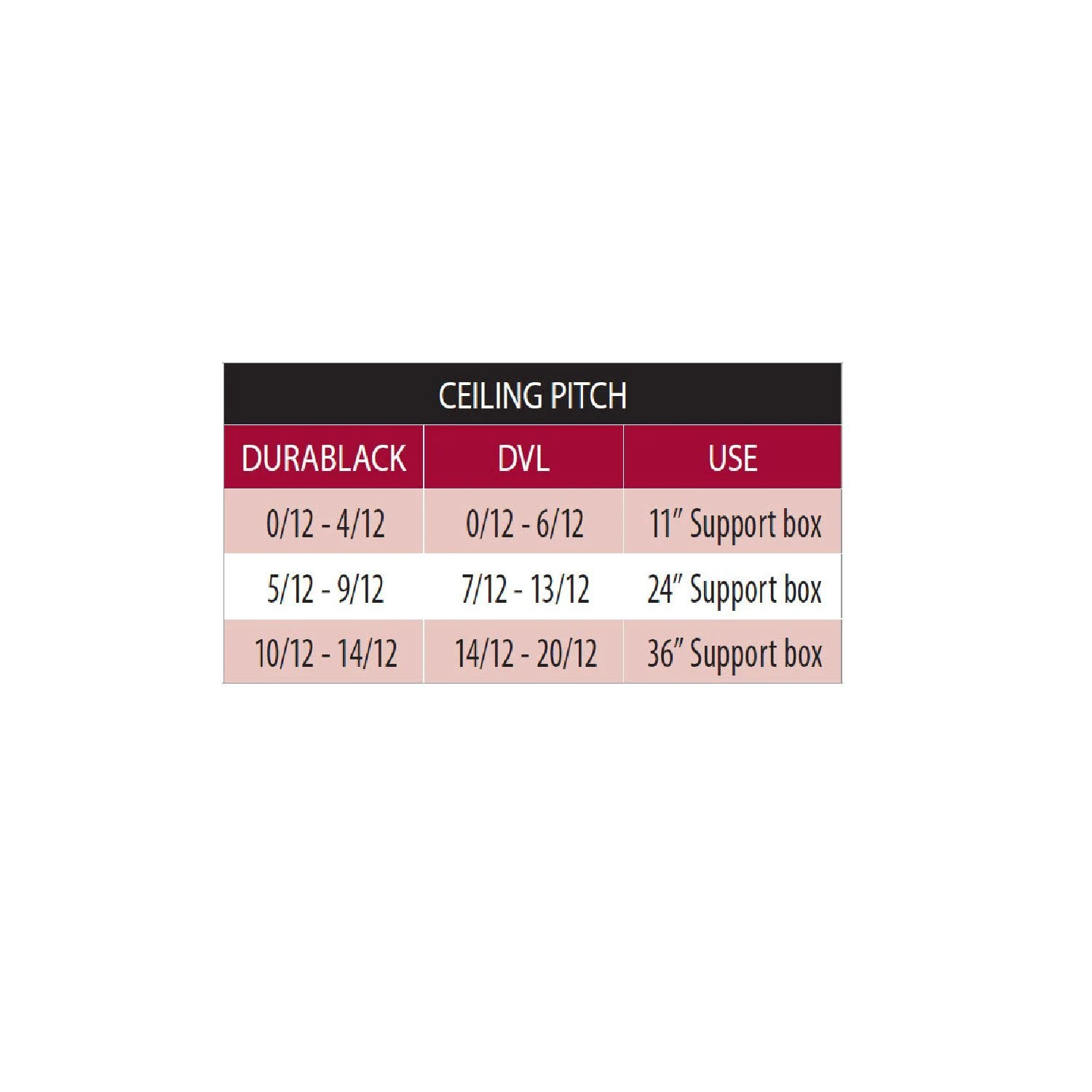DuraVent 6DT-CS DuraTech Square Ceiling Support Box, 6-Inch Diameter provides a high quality black support box for your DuraTech chimney system. A 2-inch wide trim collar is included. This supports chimney pipe and provides a positive connection between the support box and chimney with a built-in twist-lock. This square ceiling support box is suitable for both flat and cathedral (A-Frame) ceiling applications, as well as short attic spaces. It fits between standard 16-inch on center joists and most manufactured home applications. The square ceiling support box supports up to 60 feet of DuraTech Chimney. An adapter is needed to attach DVL or DuraBlack to the support box.