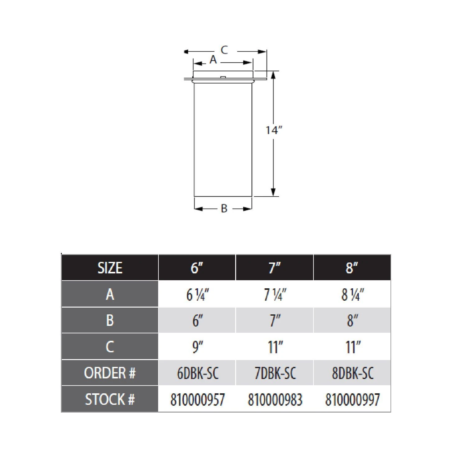 DuraVent DBK-SC DuraBlack Slip Connector with Trim provides a premium product for use with the DuraBlack chimney system. This connector adapts a DuraBlack pipe to a 6- to 8-inch ceiling support box, including DuraTech, DuraPlus, and DuraTech Premium Systems and adds 3 to 13 inches of length to rigid pipe. This slip connector can also be added to 6- to 8-inch DuraTech finishing collars.
