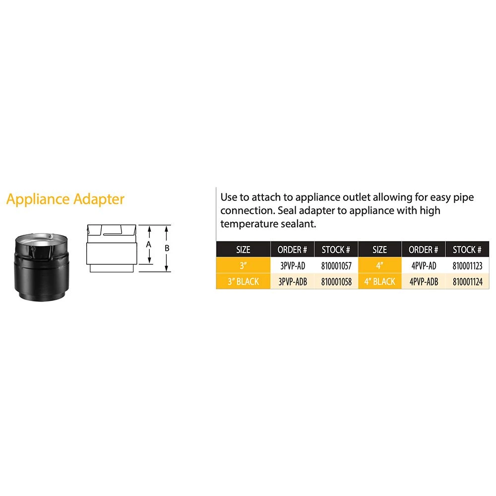 DuraVent PVP-ADB PelletVent Pro Black Steel Appliance Adapter provides an attach for your appliance outlet allowing for easy pipe connection. Seal the adapter to the appliance with a high temperature sealant.