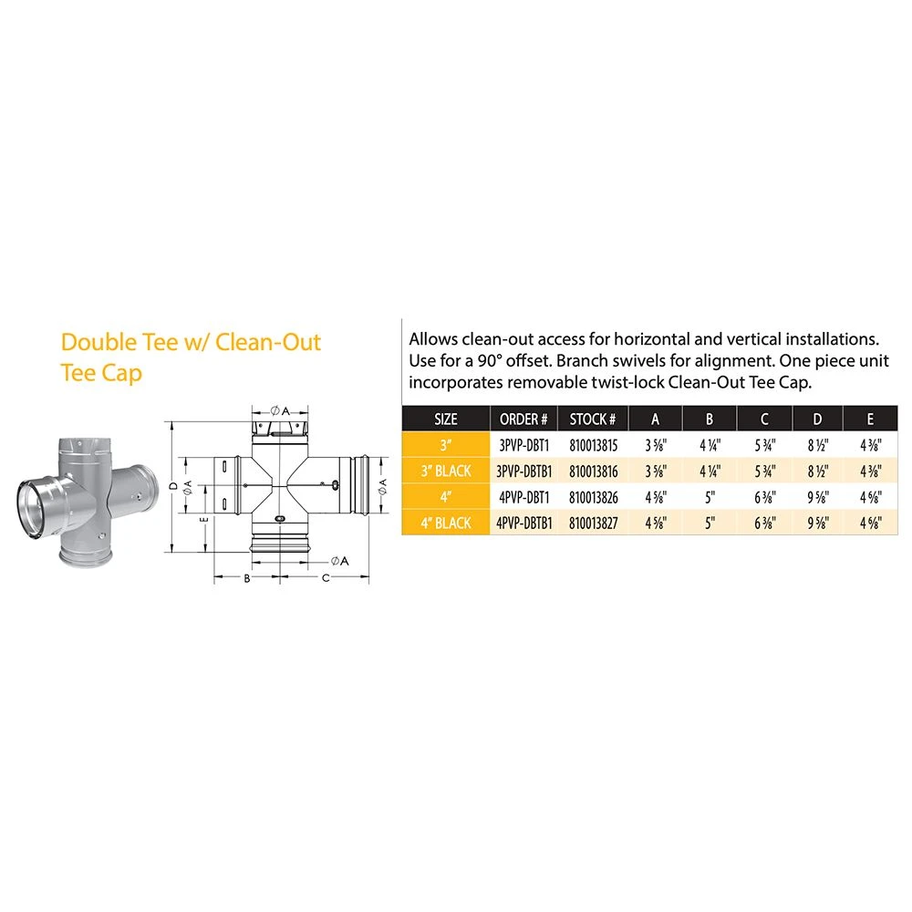 DuraVent PVP-DBTB1 PelletVent Pro Black Steel Double Tee with Clean-Out Tee Cap allows clean-out access for your horizontal and vertical installations. This is used for a 90? offset and the branch swivels for alignment. This one piece unit incorporates a removable twist-lock Clean-Out Tee Cap to make it easier to clean and maintain your pellet stove.