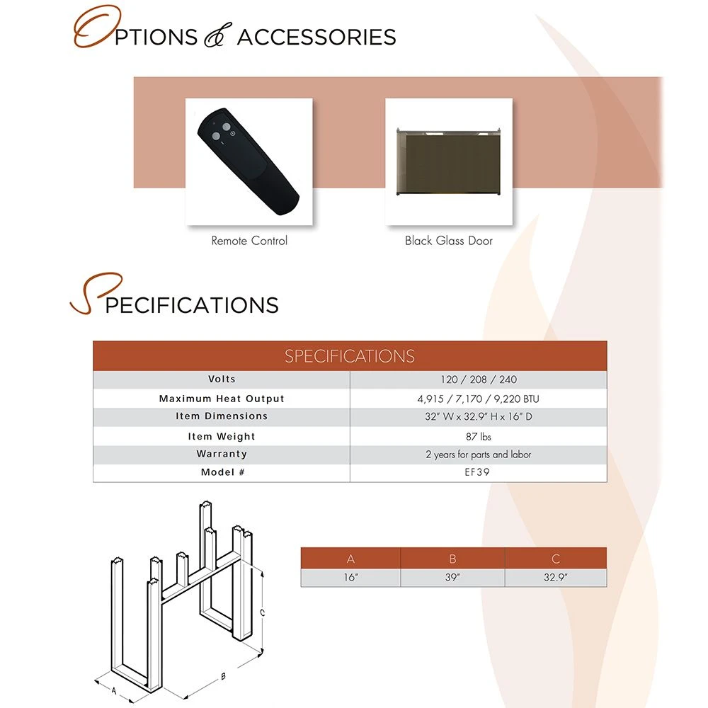 - LED logs and a pulsating ember bed create a realistic firebox effect for a pleasant viewing experience.