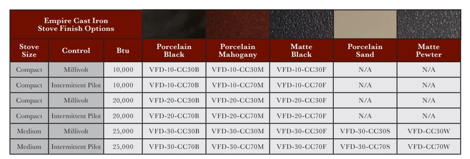 White Mountain Hearth VFD30CC Cast Iron Ventless Gas Stove with 25K Contour Burner, 28.25-Inches provides a premium freestanding vent-free cast iron stove option for your perfect living space. This 28.25-inch ultra-realistic gas-fired stove features the Empire Contour burner system (25,000 BTU capacity), ensuring vibrant flames thanks to the Precision-Port technology. The included 6-piece hand-painted ceramic fiber logs add a durable component to an already stunning fire feature that boasts strong lines and high detail. Empire gives the option to choose a Millivolt or Intermittent Pilot valve, fuel type, and one of 5 different color options (Matte Black, Matte Pewter, Porcelain Sand, Black Porcelain or Porcelain Mahogany). This stove requires the RCK30 Replacement Control Cover IF you use the RVKN or RVKP variable flame kit for Intermittent Safety Pilot. Add an eye-catching gas appliance to your home with help from Empire!