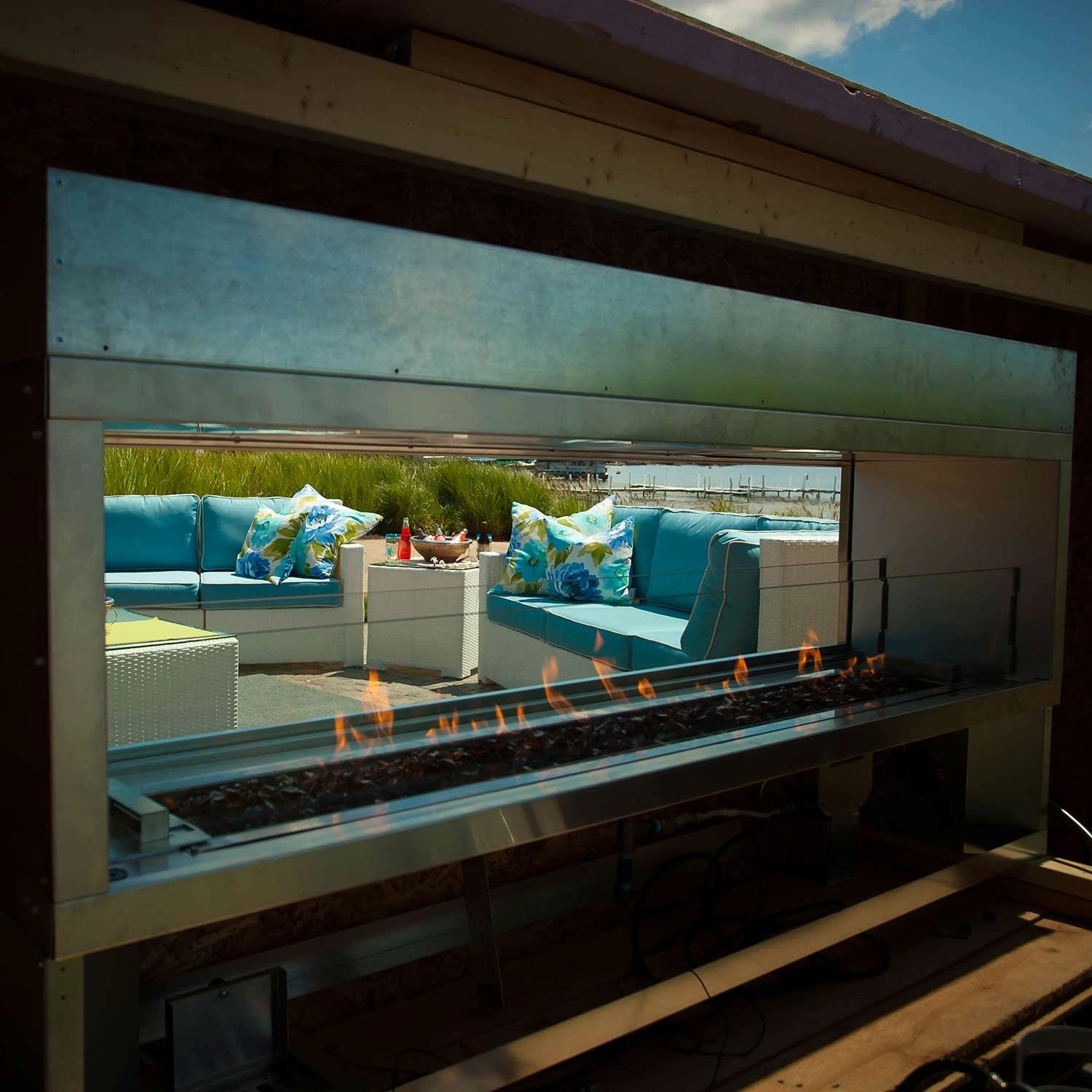 Firegear Kalea Bay Linear See-Through Outdoor Gas Fireplace with LED Lights, 60-Inch provides a contemporary outdoor fire feature to enhance any patio space. This impressive fireplace features a heavy duty 304 stainless steel firebox and burner construction to ensure a long lasting and durable product to withstand the elements. This unit requires no special venting thanks to its clean design, allowing for an easier installation–just frame and finish. An integrated electronic ignition system offers on/off and high/low flame options. This system features intermittent and continuous pilot options for flexible use, while optional controls are available to further enhance the system (sold separately). The unit comes designed as a 1-sided fireplace, but is converted to a see-through appliance with an included conversion kit. The included tempered glass windshield helps protect the flame in windy conditions and helps complete the modern aesthetic of this premium fire feature.