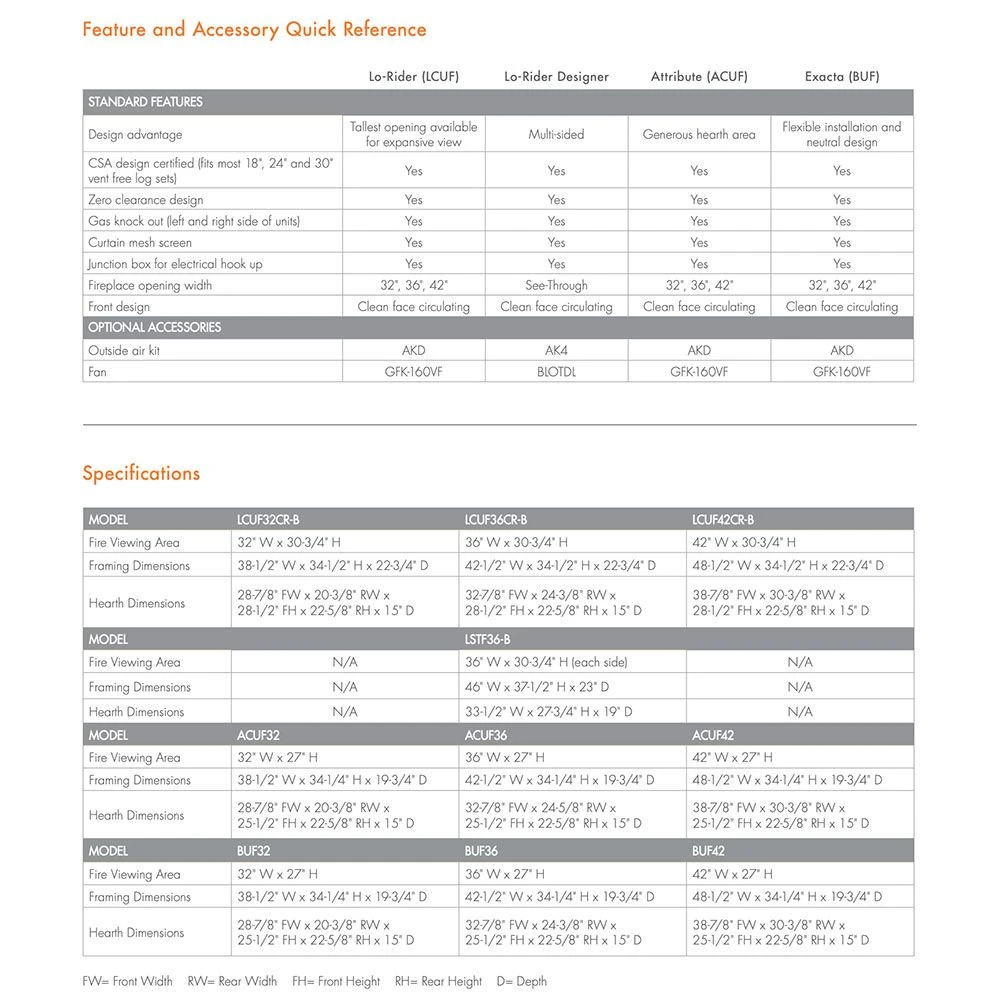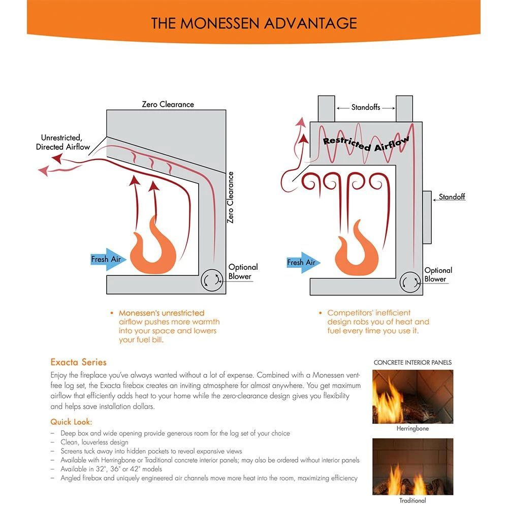 Monessen BUF42-FB Exacta 42-Inch Vent-Free Firebox provides a premium firebox option for your home, designed to be paired with a Monessen vent-free gas log set. Featuring durable construction and authentic ambiance, the Exacta firebox provides warmth and atmosphere for nearly any space. A clean, louverless design offers a high quality appearance, while a hideaway fireplace screen allows for impressive firebox viewing potential. This fireplace has also been engineered for maximum efficiency with an innovative angled firebox and air channels designed to move more heat into the room.