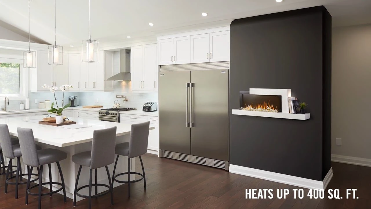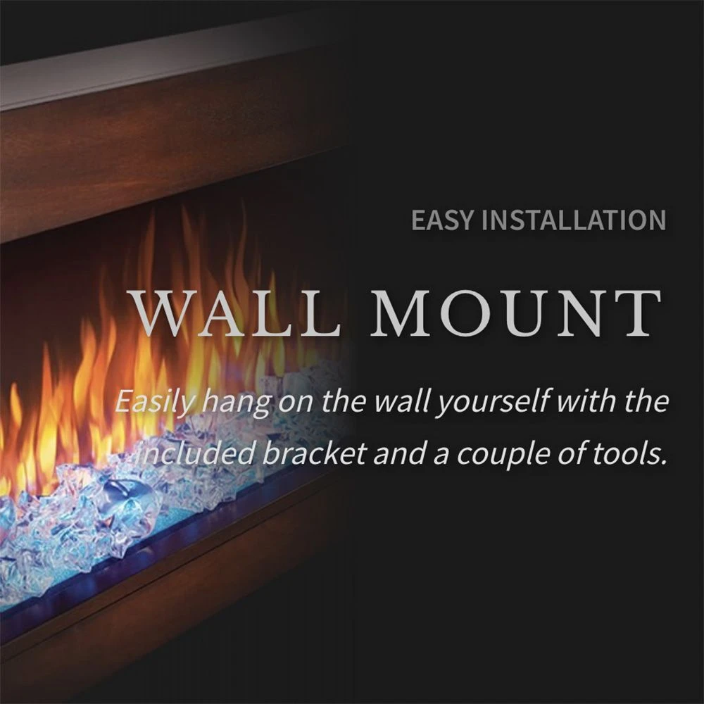 Napoleon NEFP32-5320BW Stylus Steinfeld Wall Mount Electric Fireplace with Remote and Wood Surround provides a beautiful wall mount fireplace option to enhance your favorite indoor living space. The shelf is lit up by an accent light and features a smart LED double USB plus that shows red when your device is charging and changes to green when it is fully charged. The flames have four color settings with brightness adjustment options while the ember bed features six color settings, including cycle and fade in and fade out, providing the ultimate in customization. This modern design fireplace features a combination of a birch log set and crystal media. It can heat up a 400 sq. ft room and can be used year round as the flames can operate without the heat.