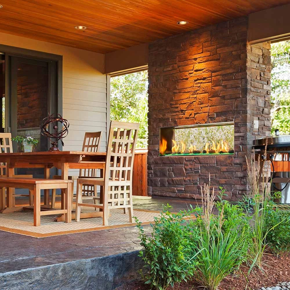 Outdoor Lifestyles Lanai 48-Inch Linear Outdoor See-Through Gas Fireplace with IntelliFire Ignition provides a 48-inch see-through gas fireplace for your outdoor space. Equipped with IntelliFire Touch ignition system, this technologically advanced fireplace is a must have for your outdoor oasis. Light up your landscape with this fireplace as the night comes alive with it’s glowing flames and colorful crushed glass firebed.