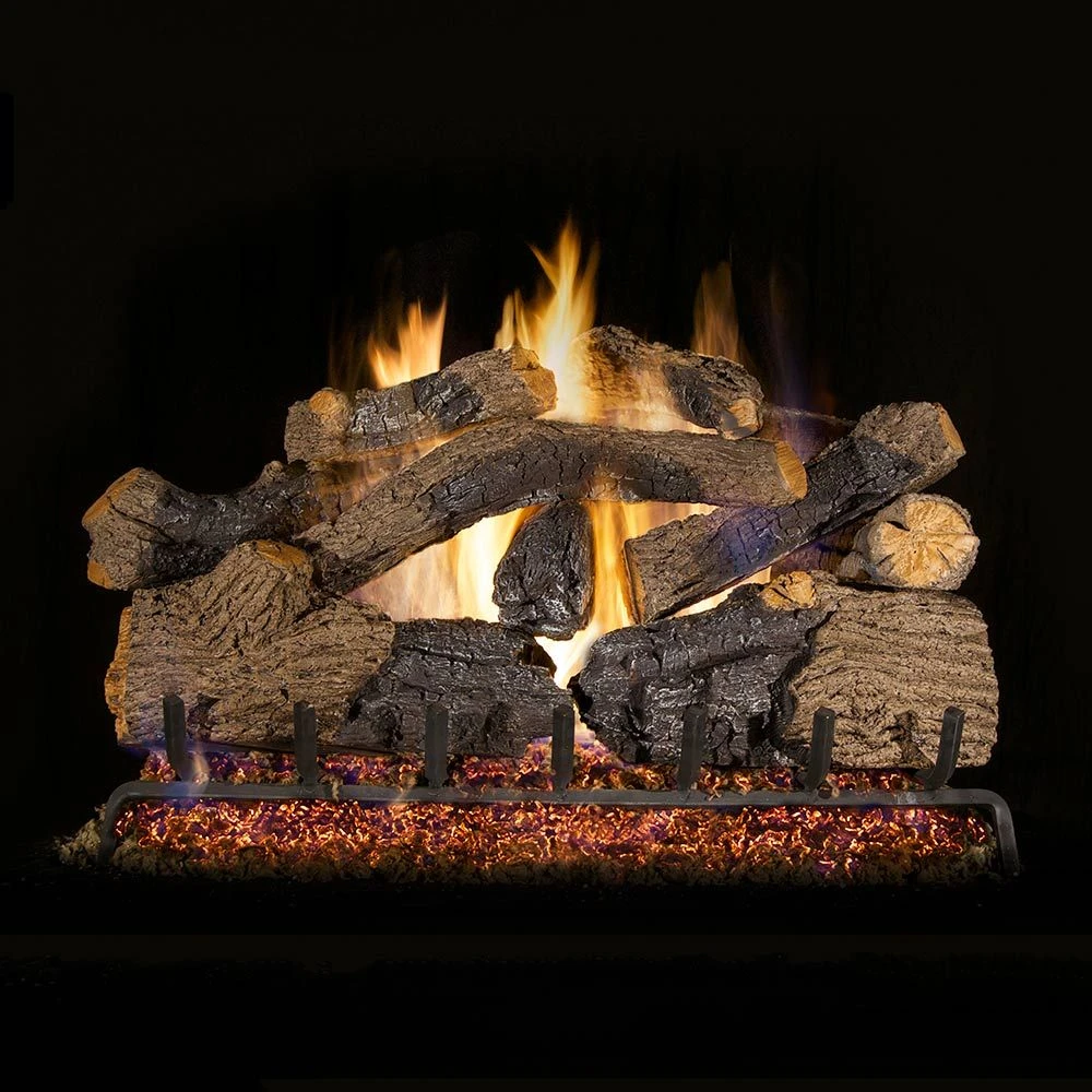 Real Fyre CHGO Charred Grizzly Oak Vented Gas Log Set, Stainless Steel provides a high end gas log set to enhance your favorite living space with the warmth and comfort of fire. This vented unit is designed to turn your wood burning fireplace into an efficient and warm gas log set that should be used in an approved masonry or approved vented firebox enclosure. The high quality stainless steel construction allows these burners to be used outdoors in addition to traditional indoor use. This unit requires manual on/off ignition; if a safety pilot is added later, the pilot light must be match lit and will run continuously to provide ignition to the unit. The unique Charred Grizzly Oak log design provides a realistic set of refractory ceramic gas logs that are designed to provide long term durability.