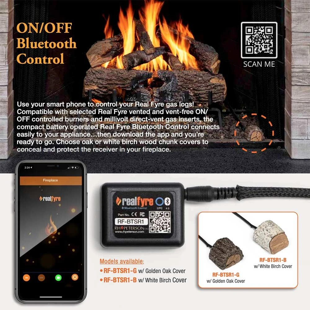 Real Fyre RF-BTSR1 On/Off Bluetooth Control with Log Cover offers a convenient technological control option for your Real Fyre gas burner system. Using Bluetooth connectivity, you can operate your fireplace from the comfort of your couch. It also comes packaged with a log cover to disguise the receiver for an attractive look.