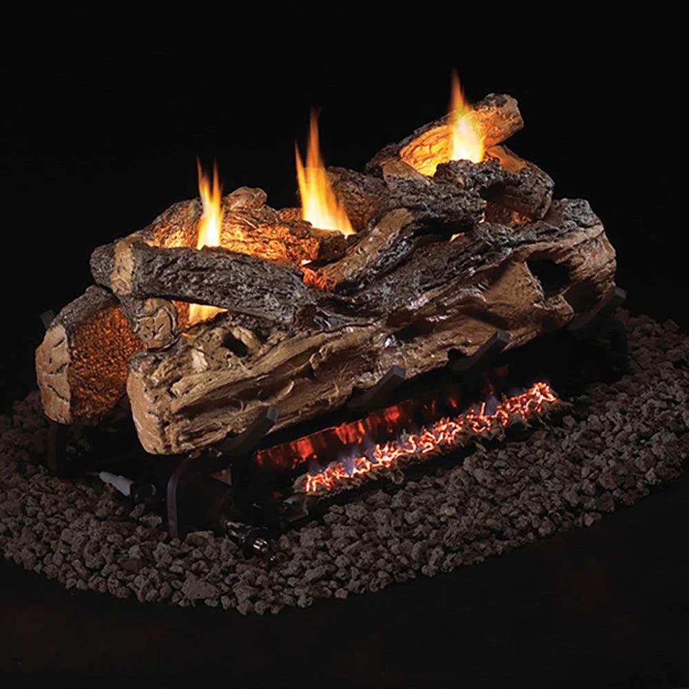 Real Fyre S9-2 Split Oak Ventless Gas Log Set, See-Thru, ANSI Certified provides a high-end gas log set to enhance your favorite living space with the warmth and comfort of fire. This vent-free unit is designed to turn your wood burning fireplace into an efficient and warm gas log set and the unique “see-thru” design is intended to be used in an approved 2-sided masonry or ventless firebox enclosure. This unvented system features an Oxygen Depletion Sensor (ODS) to monitor the amount of oxygen available in the room and automatically shut the burner system off before the oxygen drops below 18%. This unit features the an automatic pilot kit with an On/Off remote control while the ODS pilot will be lit continuously to provide ignition for the unit. The unique Split Oak log design provides a realistic set of refractory ceramic gas logs that are designed to provide long term durability with a life-like appearance and the “split” appearance allows the logs to be reversible for a custom look.