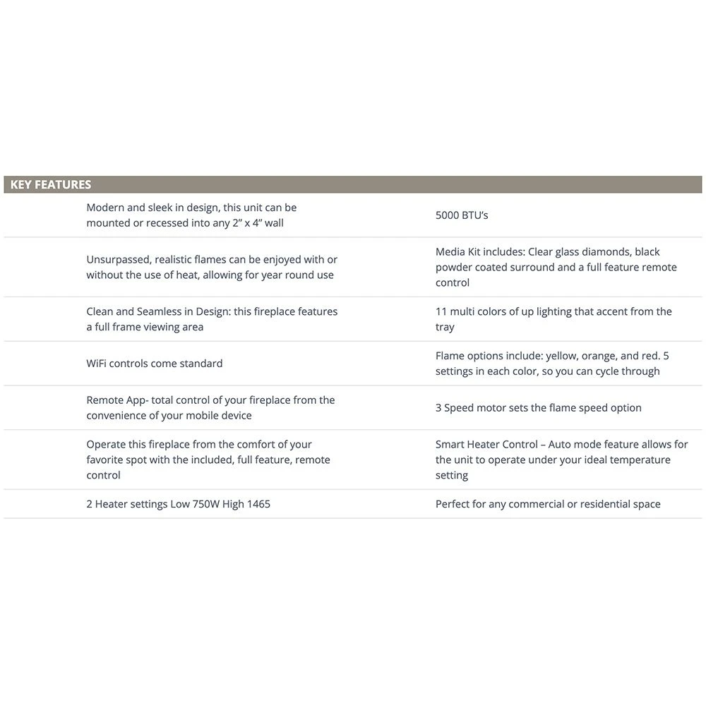 - Features award-winning flame presentation for a visually stunning appearance and multiple flame color options