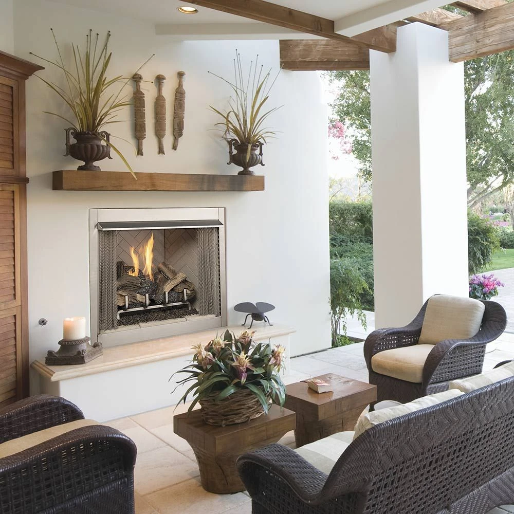 - Premium refractory brick liners and realistic ceramic fiber gas logs offer an authentic wood fireplace appearance.