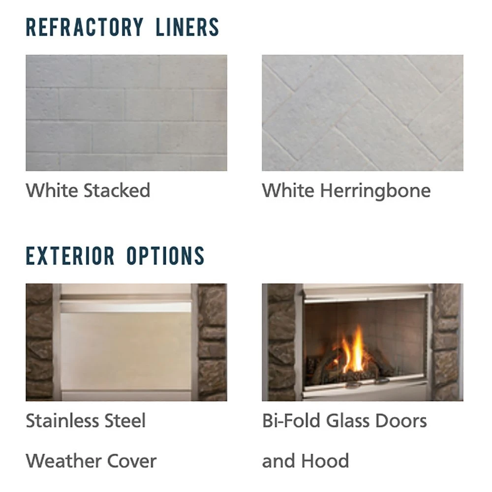- Premium refractory brick liners and realistic ceramic fiber gas logs offer an authentic wood fireplace appearance.