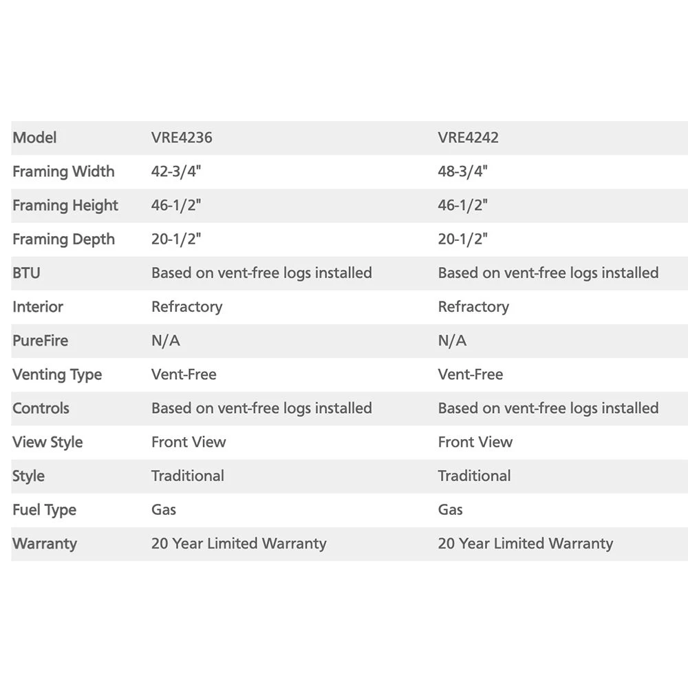 Superior 42-Inch Vent-Free Outdoor Gas Firebox with Vent-Free Gas Log Set (VRE4242) provides a premium fireplace option for your home. This vent-free gas fireplace offers a durable and attractive stainless steel appearance that makes it perfect for outdoor applications. The realistic refractory brick panels are molded from actual hand-cut firebrick for an authentic appearance, while the versatile design of this unit allows for easy integration into a variety of applications. This unit is approved for outdoor use with Superior Mega-Flame OD series gas logs. For indoor installations, this unit is compatible with any ANSI Z21.11.2 listed vent-free log set for indoor applications. Choose a Superior vent-free log set for best results.