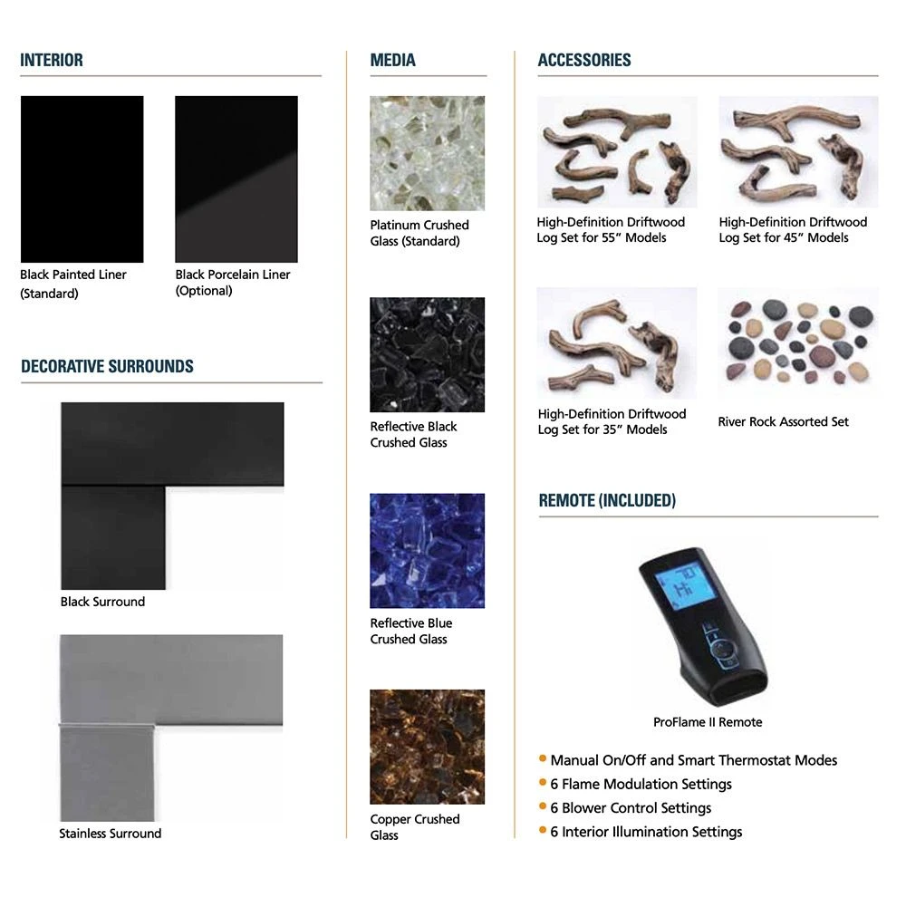 Superior DRL3545 45-Inch Electronic Ignition Direct Vent Gas Fireplace with Remote & Crushed Glass Media provides a beautiful contemporary gas vented fireplace for your space. This premium fireplace offers a combination of beauty and performance capable of making it the centerpiece of any space. Featuring a beautiful premium fire glass, a contemporary black painted interior, and a powerful burner system designed to produce tall, dancing flames, this breathtaking unit offers an impressive firebox. A clean-face design provides a seamless built-in look with tempered glass designed for optimum heat transfer and safety. An intermittent pilot ignition includes battery backup to provide continued operation in the event of a power outage, while a full-function remote offers an array of controls including flame height control. Additional optional accessories are sold separately to customize the appearance of your fireplace for additional ambiance as well.