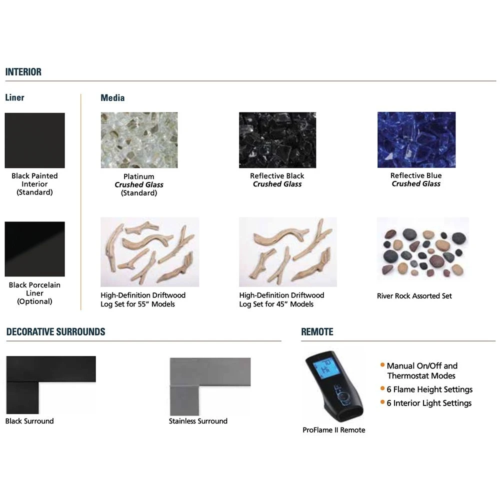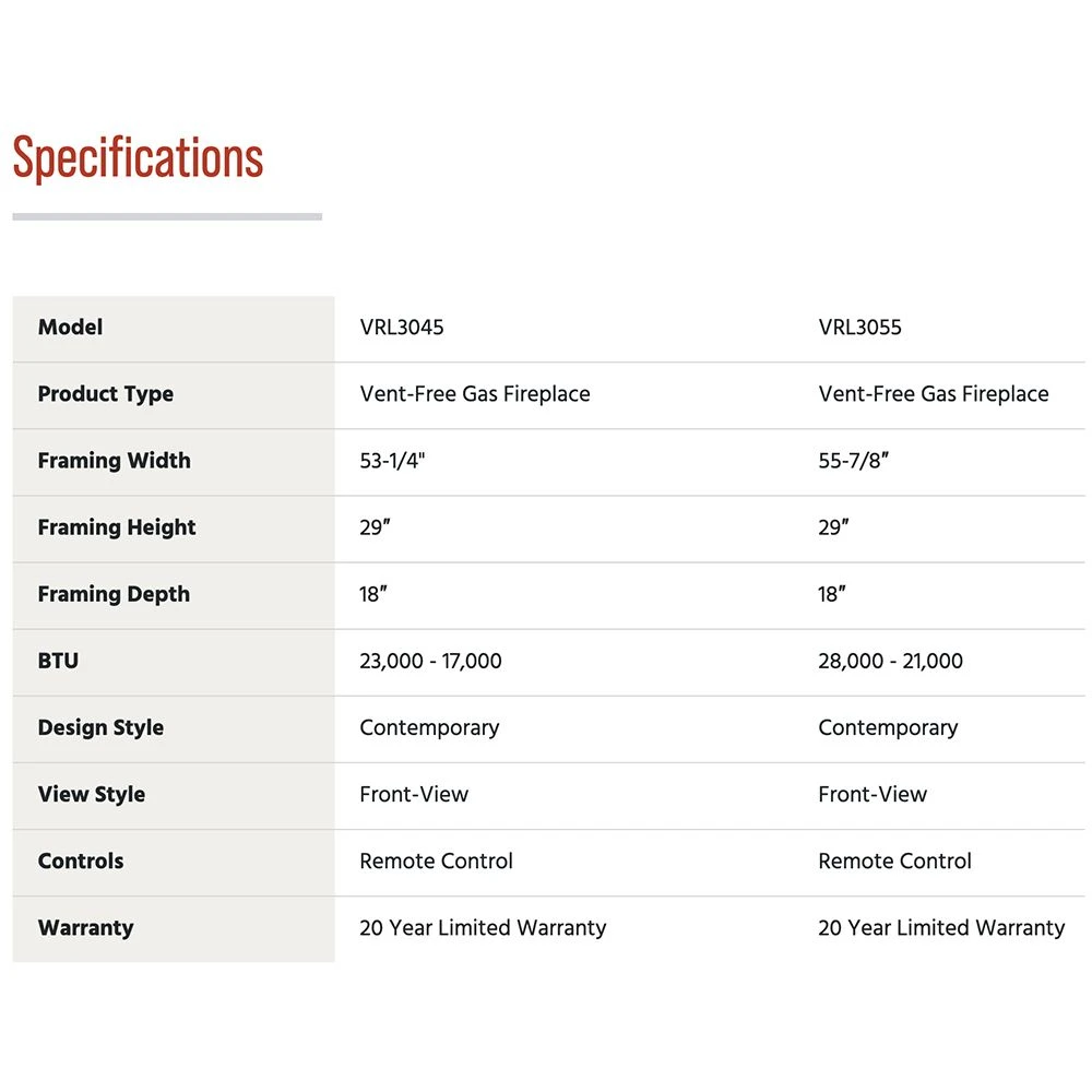 Superior VRL3045 45-Inch Electronic Ignition Vent-Free Gas Fireplace with Remote, Lights & Crushed Glass Media provides a beautiful contemporary gas vent-free fireplace for your space. This premium fireplace offers a combination of beauty and performance capable of making it the centerpiece of any space. Featuring contemporary fire glass and a powerful burner system designed to produce tall, dancing flames, this breathtaking unit offers an impressive firebox. The standard black bezel and barrier screen offer a neutral appearance that works well in any room, while interior and mood lighting offer enhanced ambiance. The electronic ignition includes battery backup to provide continued operation in the event of a power outage, while a multi-function remote control offers enhanced convenience.